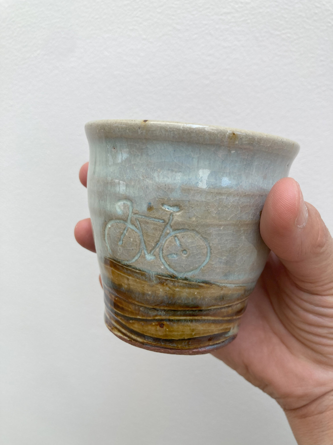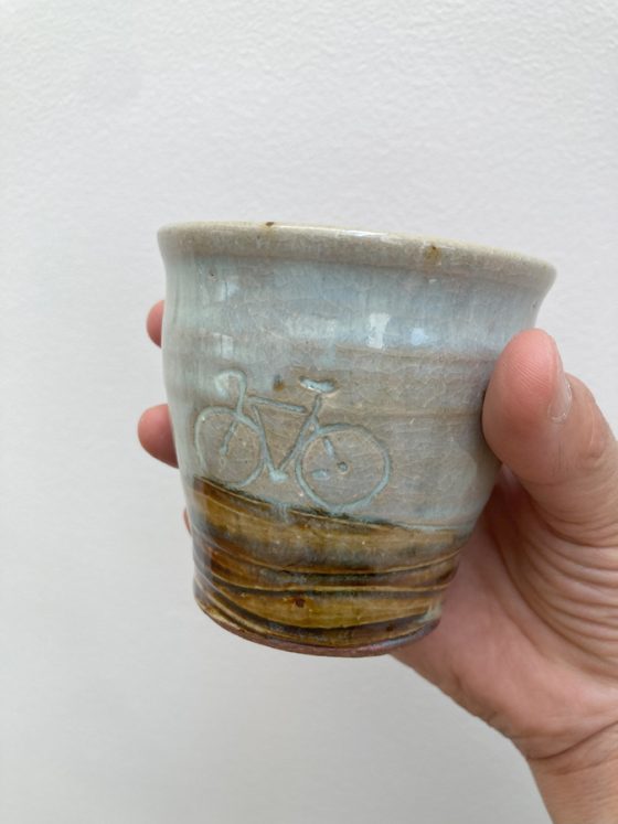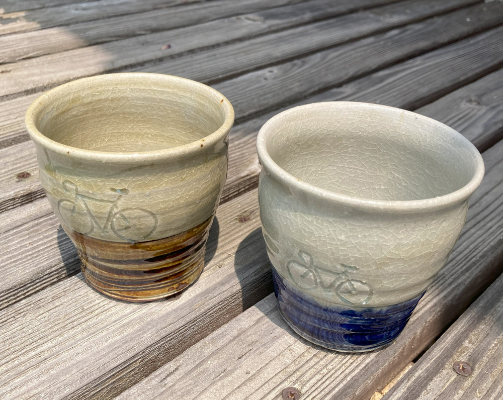デザインは優しいベースに濃い目の色を合わせたツートーン。ボトムの濃いめの色は力強い幾重ものラインが含まれていて、それまで自転車で走ってきた様々な「道/旅」を想起させます。落ち着いたベースに自転車の絵柄。自転車は小さかったり、大きかったり、どれも旅情を誘います。手になじむ独特なフォルムはもう、作り始めた当初からのものでとても使いやすいのです。