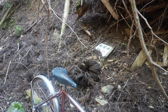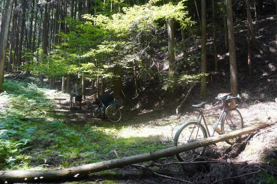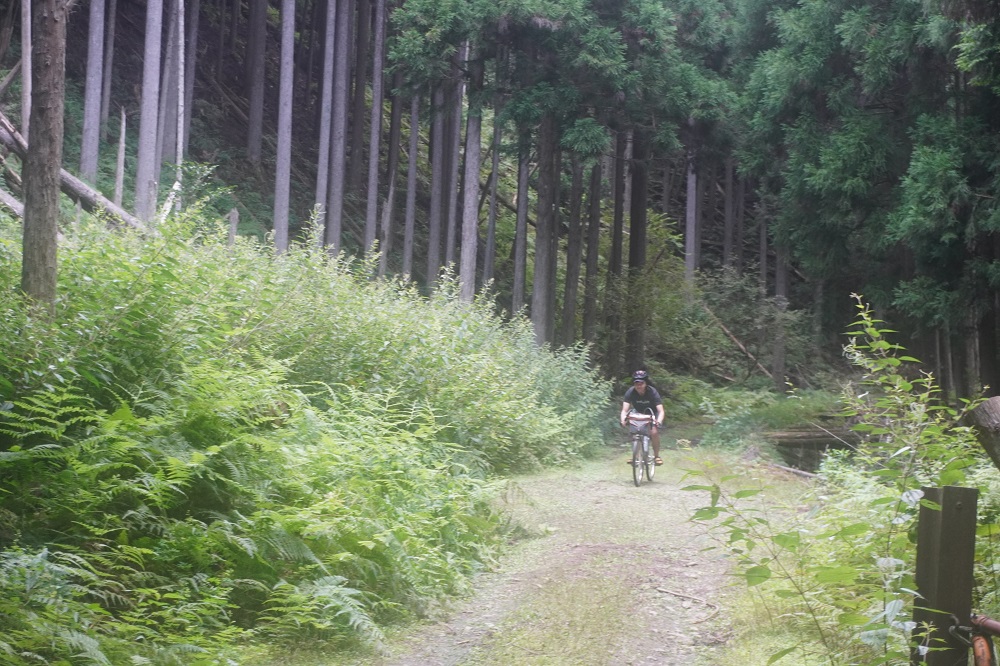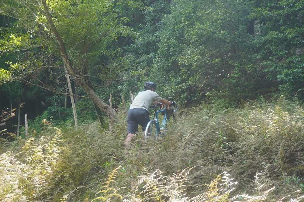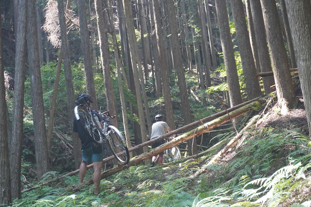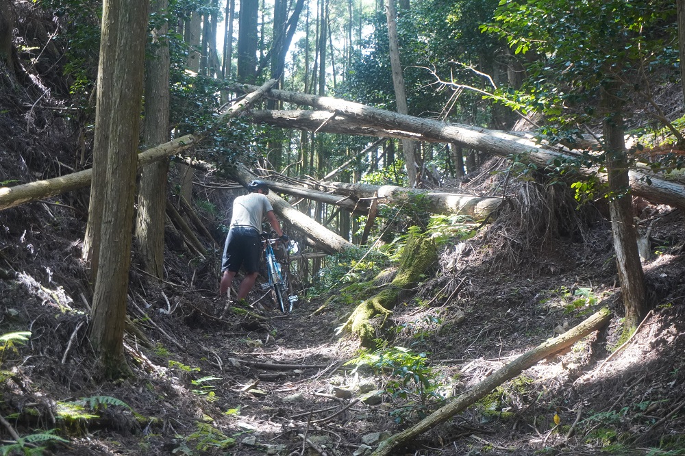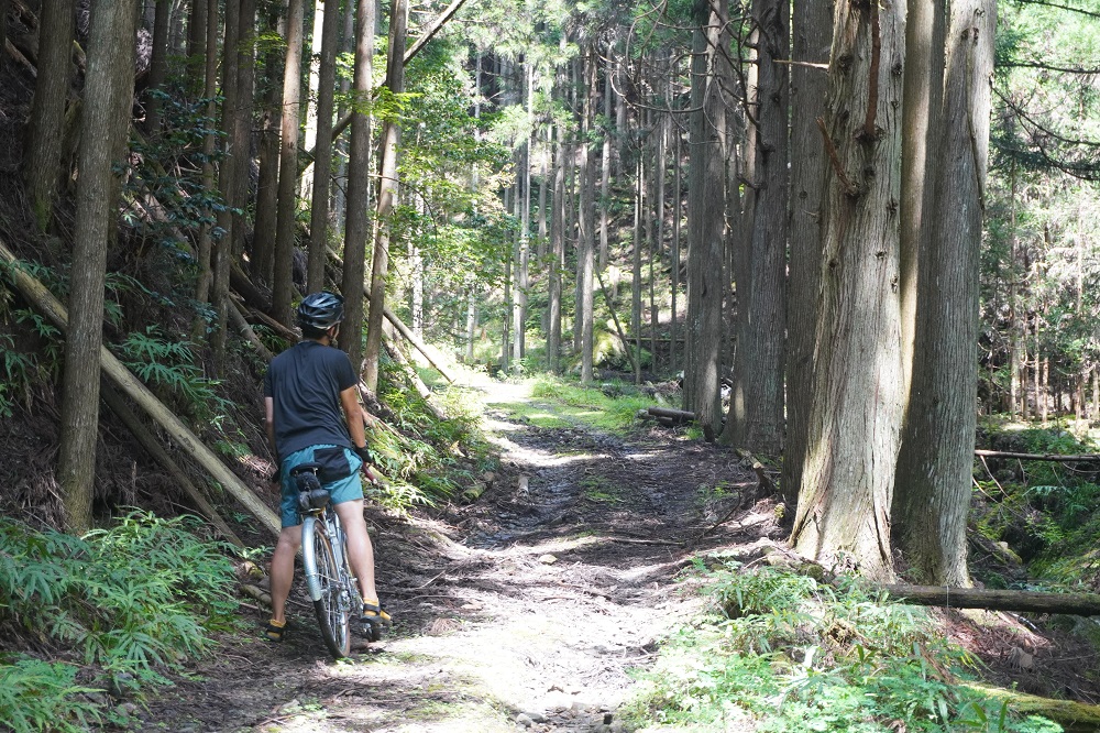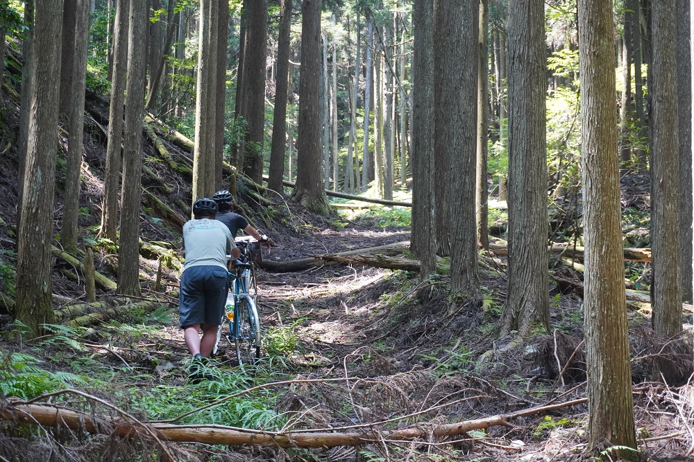 真弓八幡町の集落を抜けると林道にさしかかります。 早々に自転車から降りて押しながら進み、大半が担ぎでした。。。 こんなに担ぐコースだっけと首を傾げながら黙々と進みます。