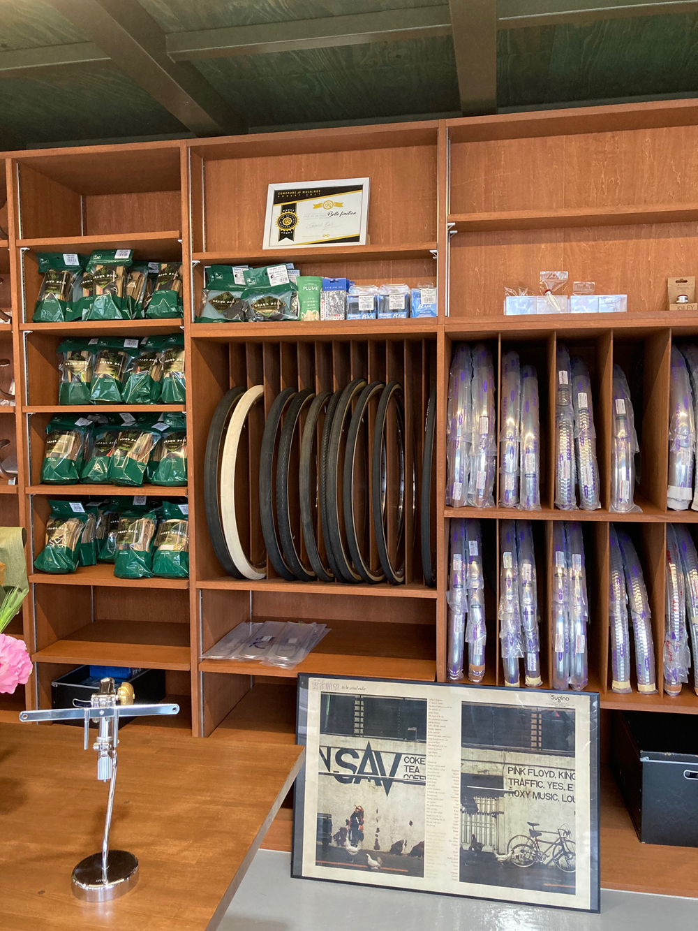 中央のテーブルから東側は完成車の展示と棚にはサドルやバッグ、チョコ店長セレクトのこだわり品などを展示しています。そして、中2階には2017年に初参加し、ベルフィニッション賞をいただいたフランスでのコンクール出品車をご覧いただけます。この展示スペースの自転車は折々代えていく予定ですのでお楽しみに。