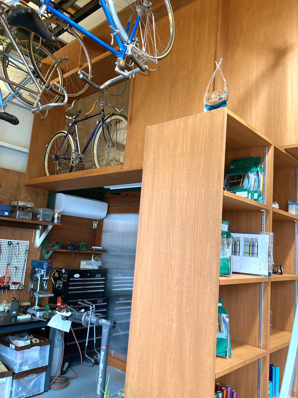 そして、西側は作業スペース。奥には磨き作業専用ルームも設置いたしました。中2階の自転車展示スペースにはアレックスサンジェの1946年のコンクール優勝車を展示し、作業を見守ってもらっています。ただし、ここでできる作業は限られており、ヴィンテージの修理などはいったんお預かりさせていただく事となります。親方から告知がありましたように、京都の北に位置する美山町にヴィンテージ専用のギャラリーも準備していますのでどうぞお楽しみに。